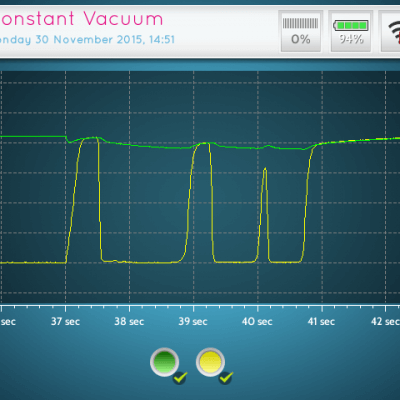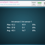 The Constant Vacuum App records vacuum fluctuation in an undefined time frame. The sampling rate can be set by the user before starting the recording. The PT-VI records data until the user stops the recording manually. From the recorded data the minimum, maximum and average value will be calculated and the results can be saved with an identifier and notes. Recorded data can be zoomed in parts and from each part that has been zoomed the minimum, maximum and average data will be recalculated and can be “saved as” with a new identifier and notes. Constant Vacuum recordings can also be recollected from the memory afterwards and from there resaved as parts of it. During recording of data a marker can be added at a moment when an event occur. Event description of a marker can be written in the notes of each recording or part of it.