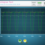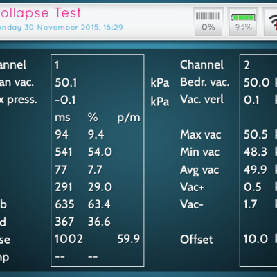 The speed of milking (causes resistance in the outlet), the tension of the teat rubber, the size of the space volume under the teat, the diameter of the short milking tube, and the type of vacuum system (simulate or alternate), are aspects that influence the cyclic vacuum variation. A second goal of the Collapse Measurement is to measure the milk phase and rest phase. The milk phase – rest phase ratio is measured by a intersecting line that is a few kPa (Inch.Hg.) lower than the milk vacuum. This kPa (Inch. Hg) level is in approximation equal to the vacuum difference necessary for the opening and closing of the liners.