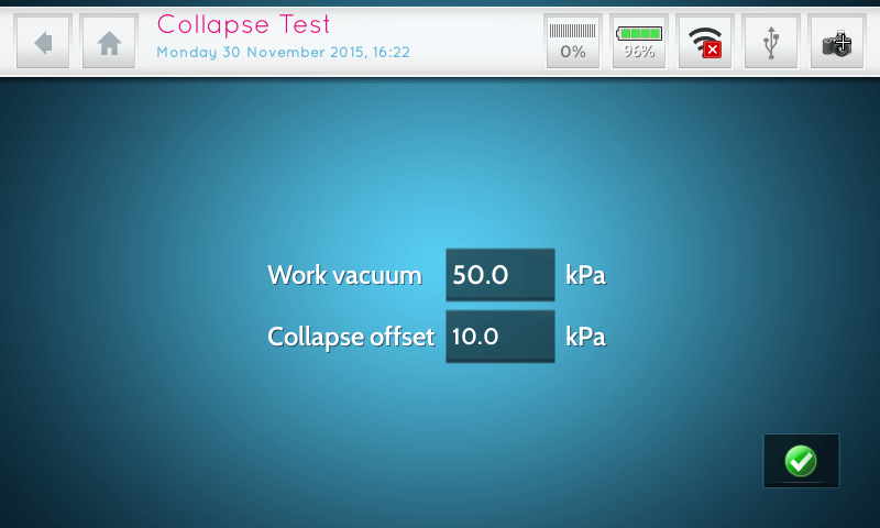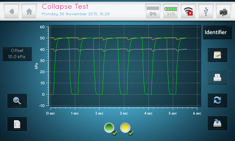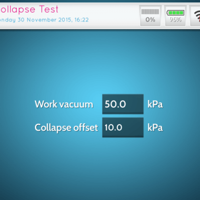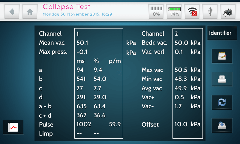 The meaning of the Collapse Measurement is to measure the cyclic vacuum variation in the milking claw. If this vacuum variation is too big there is a risk of bacteria transportation be-tween teats. This vacuum variation is caused by the change in capacity of the space volume under the teat. Opening and closing of the teat cup causes this capacity change.