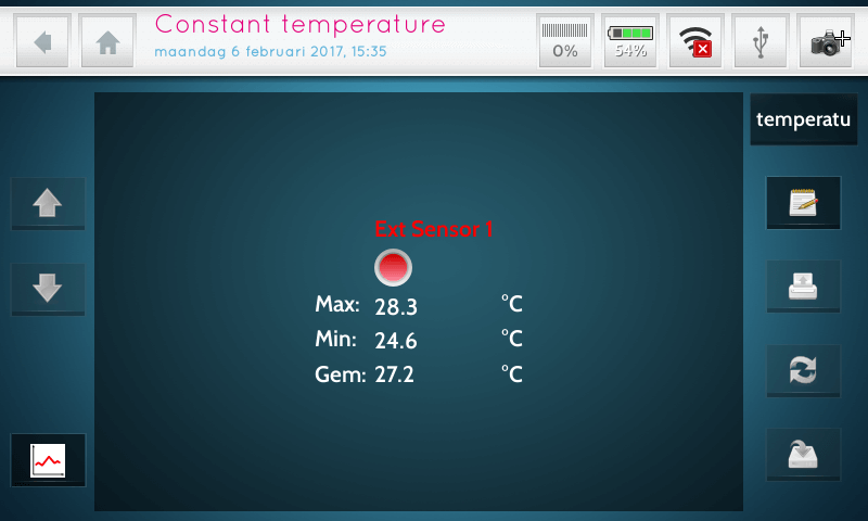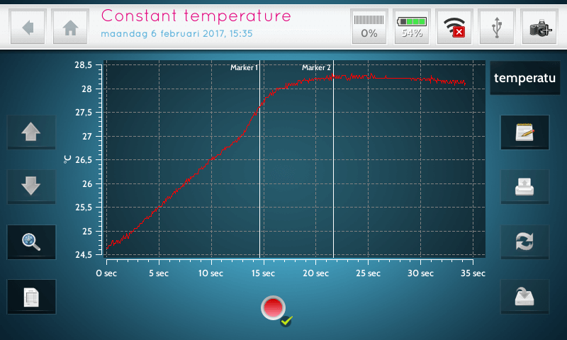 The Temperature Measurement app measures the temperature and displays the value as a static digit on the screen or records temperature fluctuations over an unspecified period of time. The PT-VI records data until the user stops the recording manually. The minimum, maximum and average values are calculated from the recorded data and the results saved with an identifier and notes. Subsets of the recorded data can be zoomed in to and for each subset that has been zoomed in to, the minimum, maximum and average data are recalculated and can be saved (Saved as option) with a new identifier and notes. Temperature recordings can also be retrieved from memory at a later time and saved as a subset. An event marker can also be added to mark events that occur during the recording. The event can be described in the notes for each recording or subset thereof.