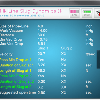 The Milk Line Dynamics App records slugs during cleaning of the Milking Installation and calculates the Duration of the Slug, Length of the Slug and Suggested Air Injection open time according to the NMC guidelines for Milk Line Slug Dynamics. Values are calculated according to the Work Vacuum, different Milk Line Diameters, Distance between the sensors and Wrong Threshold which can be entered manually before start of recording.